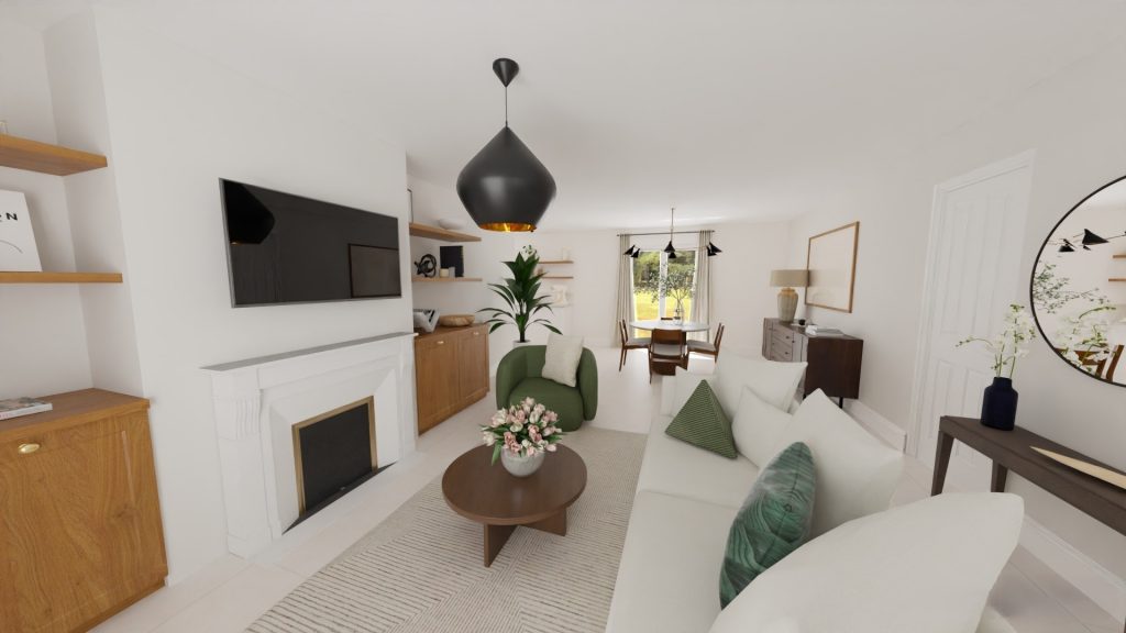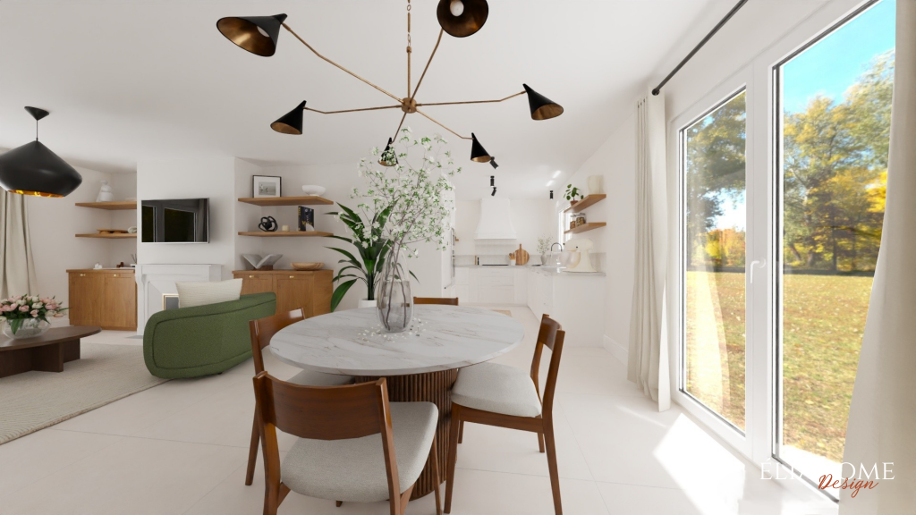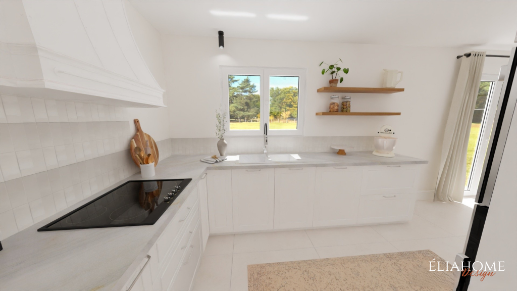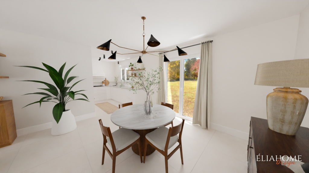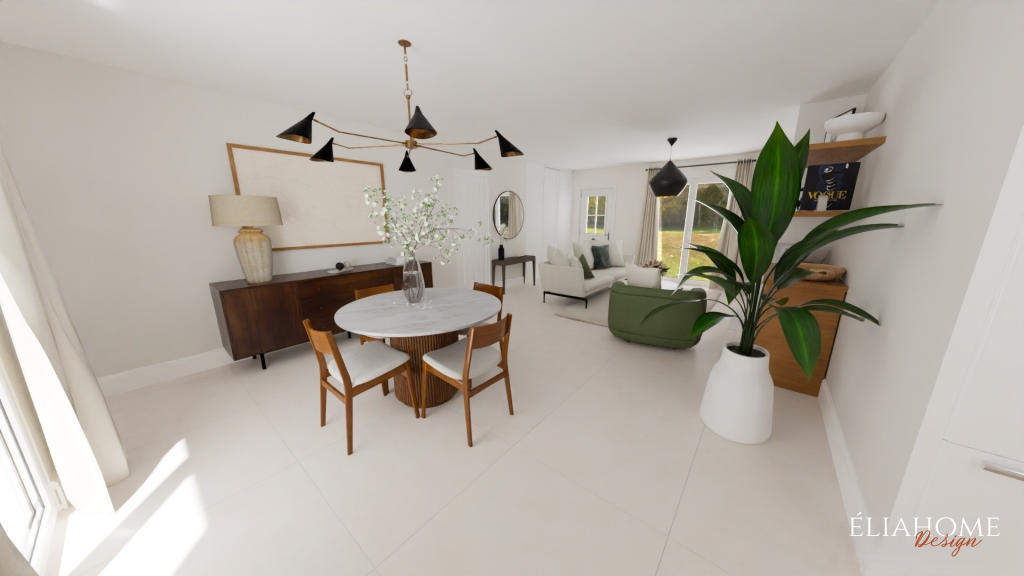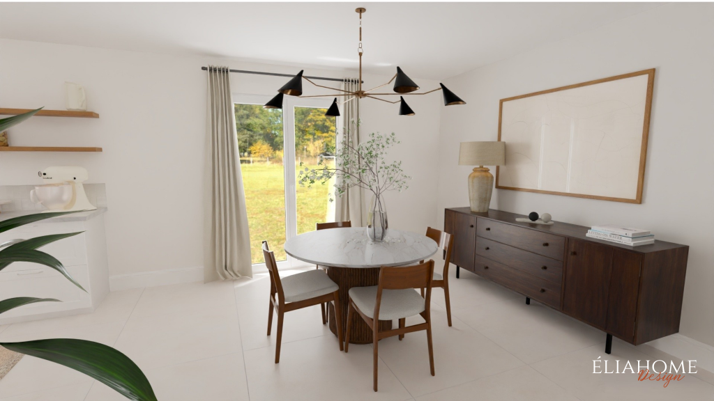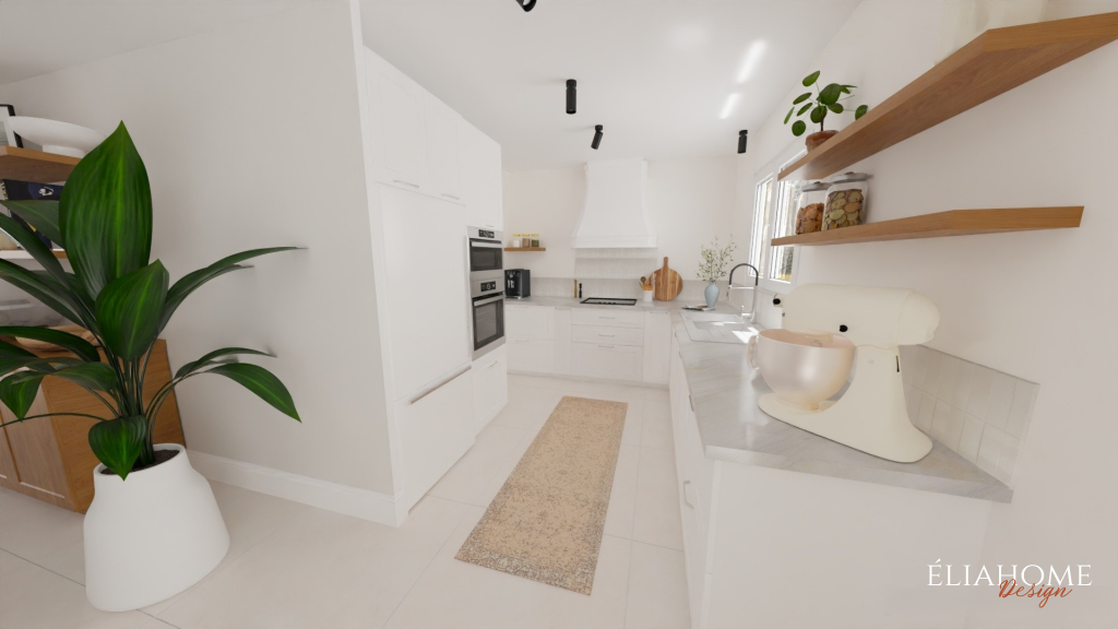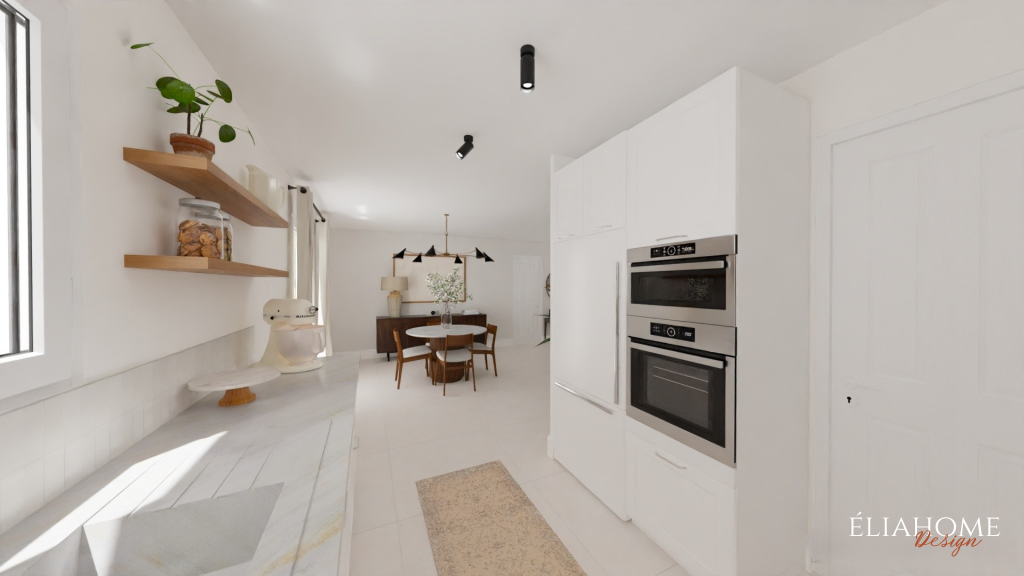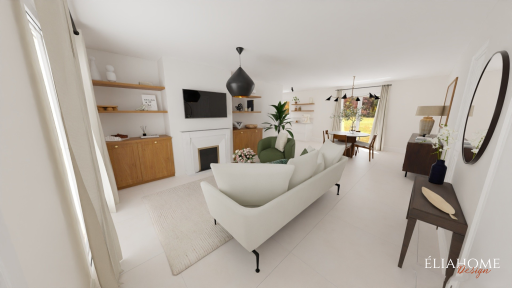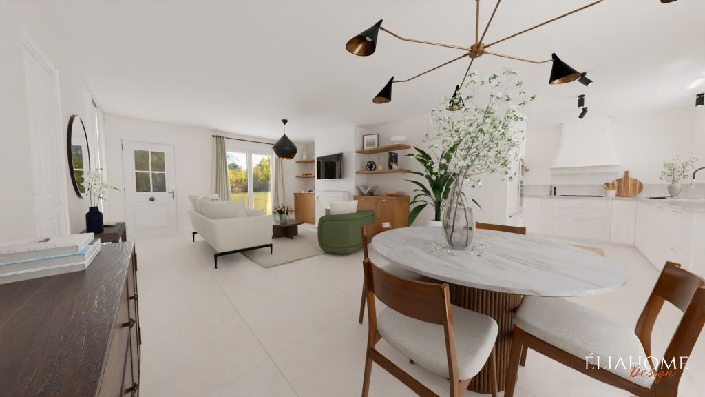 Autour de la cheminée, des meubles sur mesure avec niches viennent structurer l’espace tout en offrant des solutions de rangement esthétiques. Côté cuisine, des interventions à petit budget, changement des portes, mise en peinture des meubles existants et installation d’un nouveau plan de travail imitation marbre, permettent de moderniser l’ensemble sans gros travaux, dans une parfaite continuité stylistique avec le reste de la pièce.