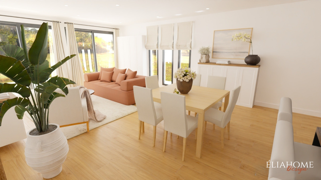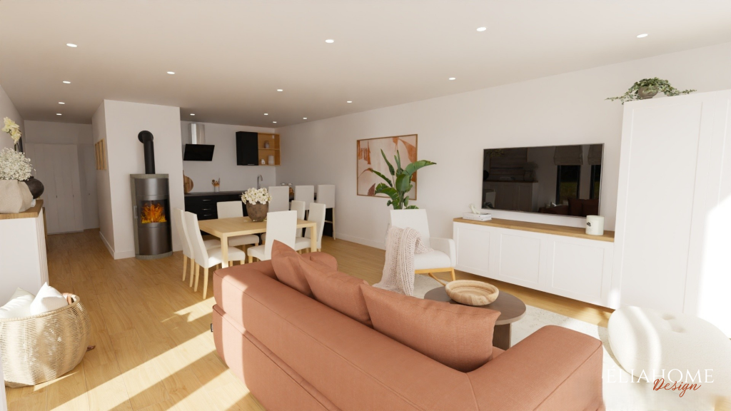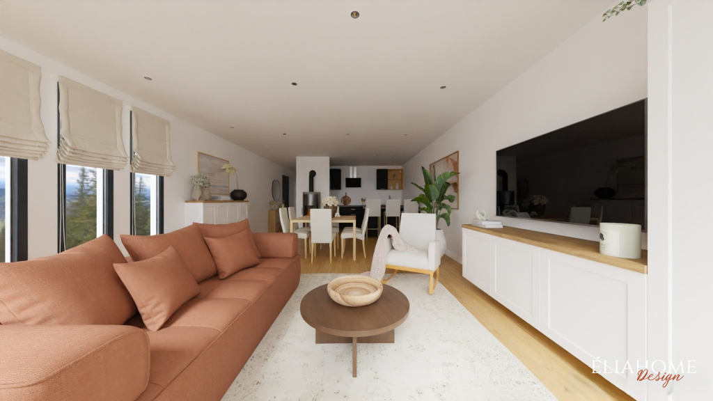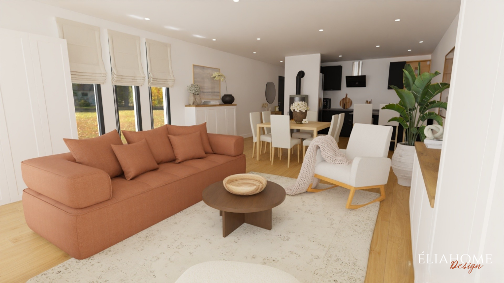 Ce nouvel agencement optimise l’espace tout en apportant légèreté et modernité. Grâce à des lignes épurées et des tons neutres, la pièce gagne en clarté et convivialité. Un canapé terracotta vient dynamiser l’ensemble et créer un contraste élégant.